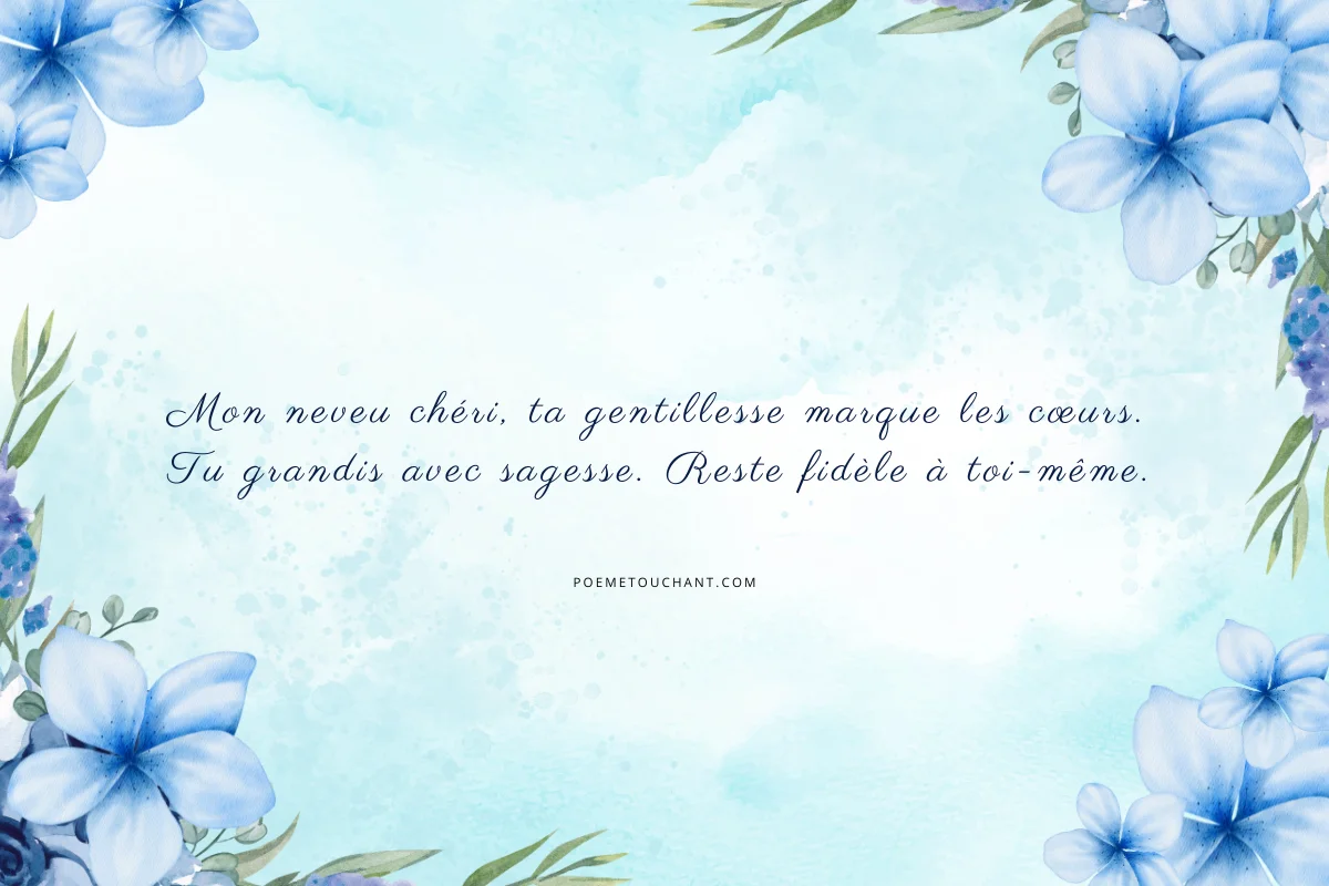 Les moments partagés avec toi ont une vraie valeur. Tu apportes équilibre et calme. Cette présence fait ta richesse, neveu aimé.