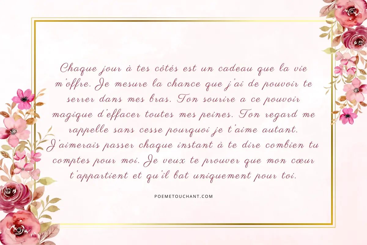 1. Chaque jour à tes côtés est un cadeau que la vie m’offre. Je mesure la chance que j’ai de pouvoir te serrer dans mes bras. Ton sourire a ce pouvoir magique d’effacer toutes mes peines. Ton regard me rappelle sans cesse pourquoi je t’aime autant. J’aimerais passer chaque instant à te dire combien tu comptes pour moi. Je veux te prouver que mon cœur t’appartient et qu’il bat uniquement pour toi.