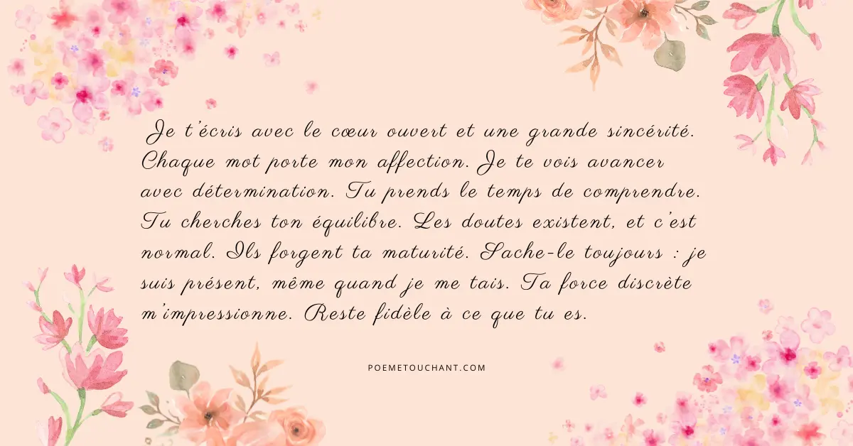 2. Quand je pense à toi, un sentiment de fierté m’envahit. Ta manière d’observer le monde révèle une grande sensibilité. Tu écoutes avant de juger. Tu réfléchis avant d’agir. Ces qualités te guideront loin. Je te souhaite la confiance en toi. Je te souhaite la sérénité. Avance sans te comparer. Ton parcours mérite le respect.