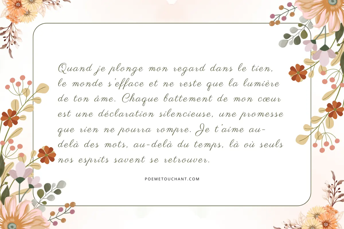 1. Quand je plonge mon regard dans le tien, le monde s’efface et ne reste que la lumière de ton âme. Chaque battement de mon cœur est une déclaration silencieuse, une promesse que rien ne pourra rompre. Je t’aime au-delà des mots, au-delà du temps, là où seuls nos esprits savent se retrouver.