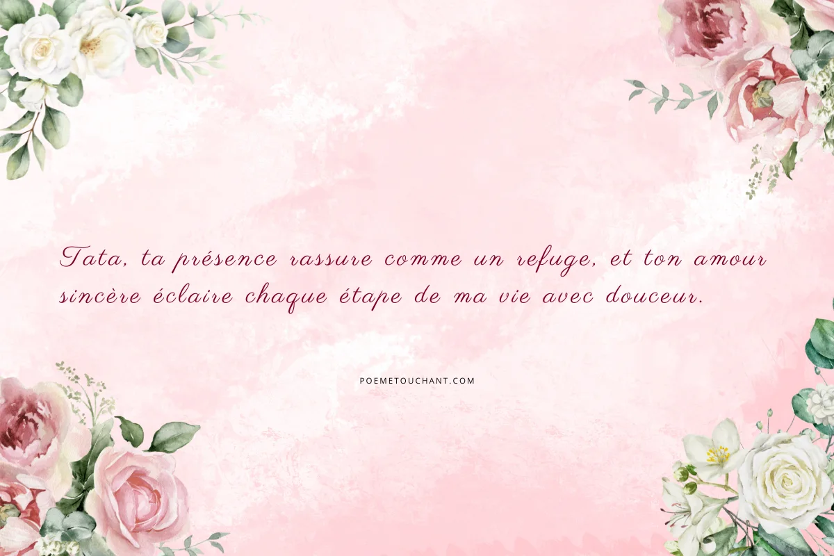 1. Tata, ta présence rassure comme un refuge, et ton amour sincère éclaire chaque étape de ma vie avec douceur.