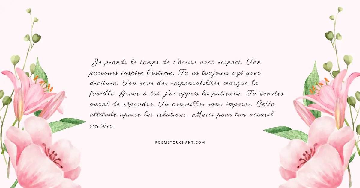 1. Je prends le temps de t’écrire avec respect. Ton parcours inspire l’estime. Tu as toujours agi avec droiture. Ton sens des responsabilités marque la famille. Grâce à toi, j’ai appris la patience. Tu écoutes avant de répondre. Tu conseilles sans imposer. Cette attitude apaise les relations. Merci pour ton accueil sincère.